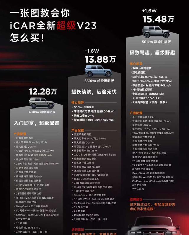 综合来看,如果你追求极致的动力性能、赛道级的操控乐趣,同时又渴望拥有征服荒野的实力,那么这款15万级的“纯电SUV性能天花板”,将满足你所有幻想。而且15.48万元的售价对于超级V23S的性能、配置来说,jue对是超值,它所能带来的情绪价值也是其它所有方盒子SUV所无法替代的。总有一款超级V23,配得上你的玩家生涯从都市通勤到跨省远行,从轻度探索到越野驾驭,iCAR 超级V23家族以清晰的定位与厚道的配置,真正实现了“闭眼入,款款超值”。通勤代步+周末轻冒险 → 选401超级运动版,12万级价值标杆;长途自驾党+续航焦虑人群 → 选550超级运动版,远行无忧;性能控+越野/赛道爱好者 → 选501巅锋性能版,一步到位;追求超高性价比、享受权益政策→ 选老款401版型,叠加权益更超值;现在,就走进iCAR授权门店,亲身感受这份超越期待的“超级玩家”体验吧!无论你是哪种需求,总有一款超级V23能满足你的期待。心动不如行动,现在就前往iCAR授权门店,感受全新超级V23家族的超凡魅力,开启您的超级玩家之旅吧